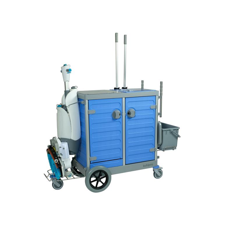 E’ dotato di serie di un ripiano di supporto per macchina lavasciuga e un apposito gancio conformato per il fissaggio della macchina i-Mop.
