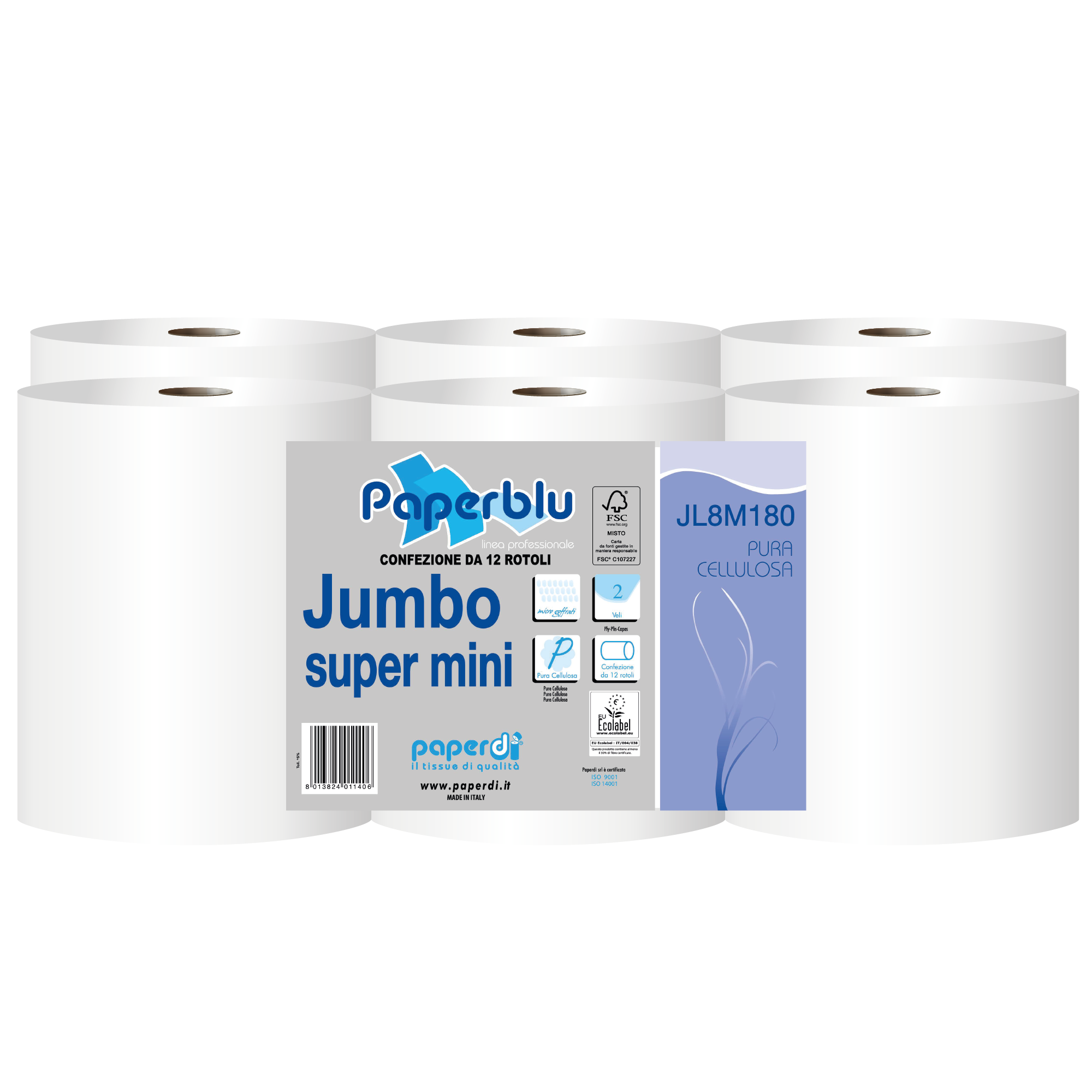 Igienica Jumbo Super Mini. Nuova lavorazione micro goffrata 2 veli. Pura Cellulosa. Grande assorbenza, resistenza alla trazione e morbidezza al tatto.
