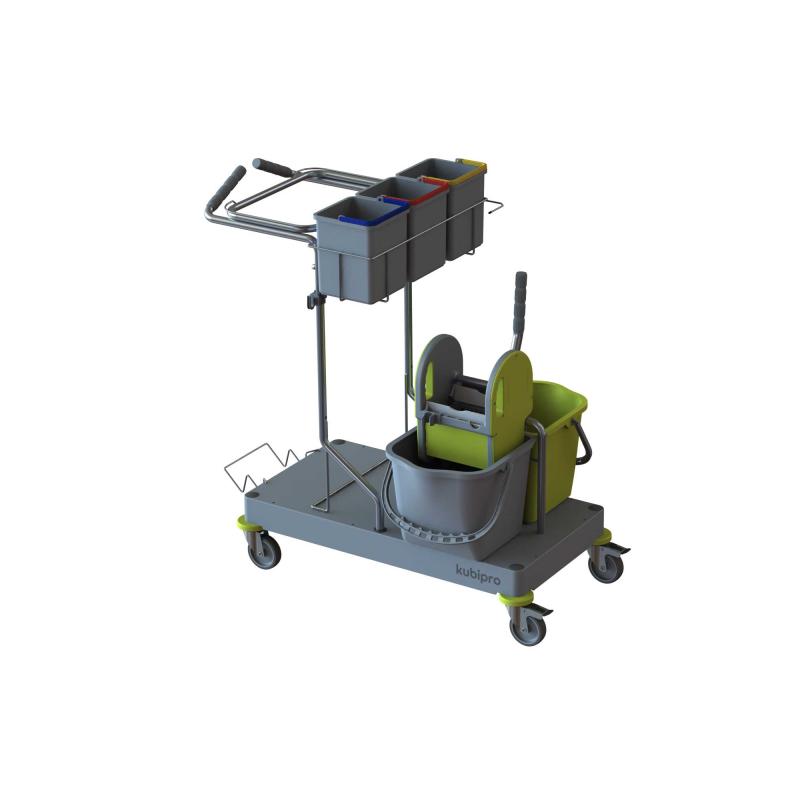 La configurazione classica del carrello per comunità e trova il suo impiego dove sono presenti pavimentazioni da lavare con metodo tradizionale mop o a piatto con pressa a rullo.