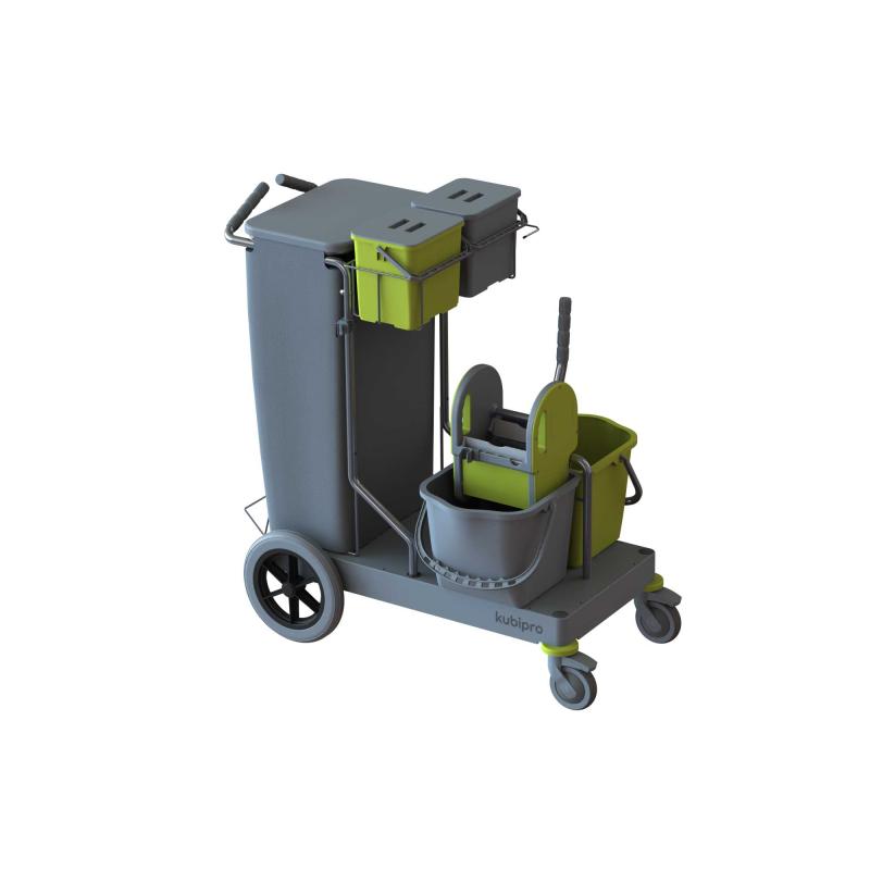 La configurazione classica del carrello per comunità e trova il suo impiego dove sono presenti pavimentazioni da lavare con metodo tradizionale mop o a piatto con pressa a rullo.