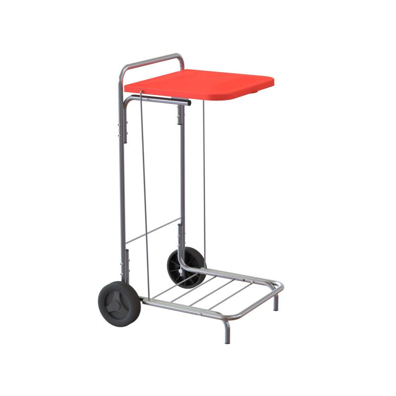 Carrello con coperchio con apertura a pedale e due grandi ruote per la raccolta dei rifiuti e lo svuotamento dei cestini.