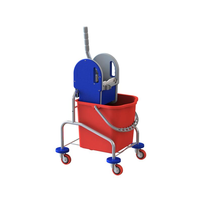 Disponibile di serie nel colore blu/rosso, è il carrello di lavaggio ad un secchio più raffinato della gamma Falpi.